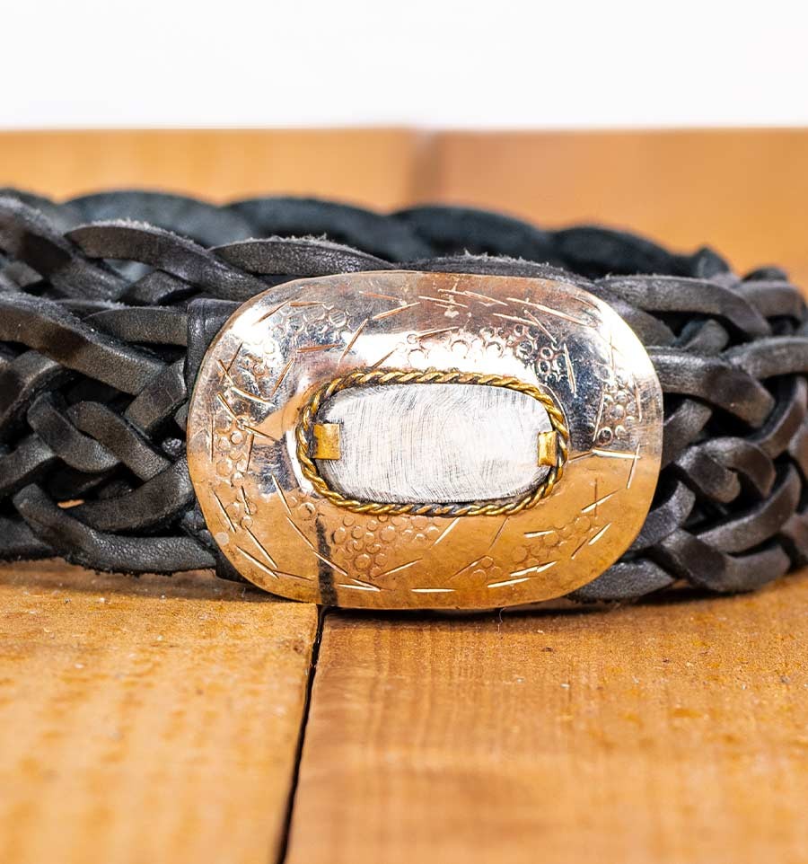 Un cinto boho chic en cuero trenzado. Pieza central decorada con asta de vaca. Hebilla de alpaca y cierre de latón. Un cinturón de cuero para mujer que se adapta a gran variedad de medidas por su sistema de enganche en cualquier punto del mismo a través de su trenzado. Un cinturón artesanal, por lo que no hay dos iguales.