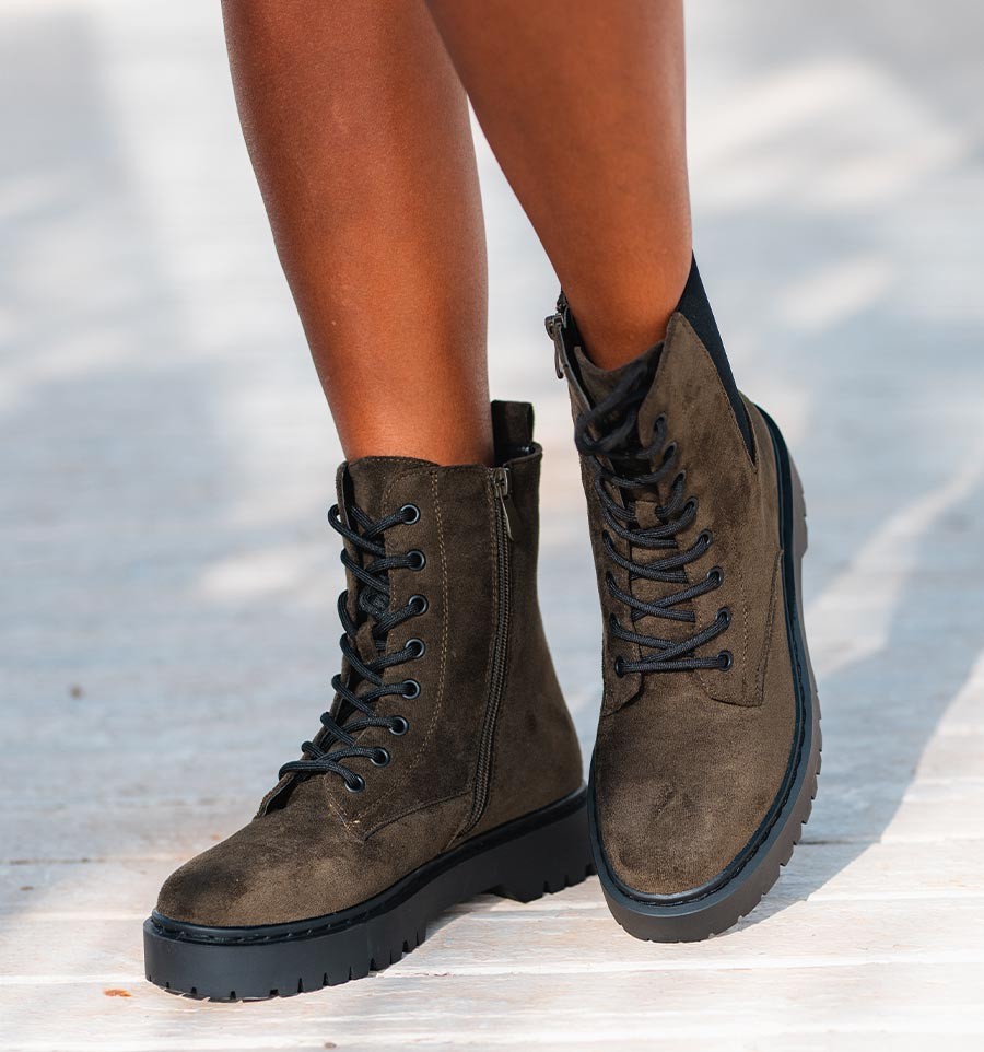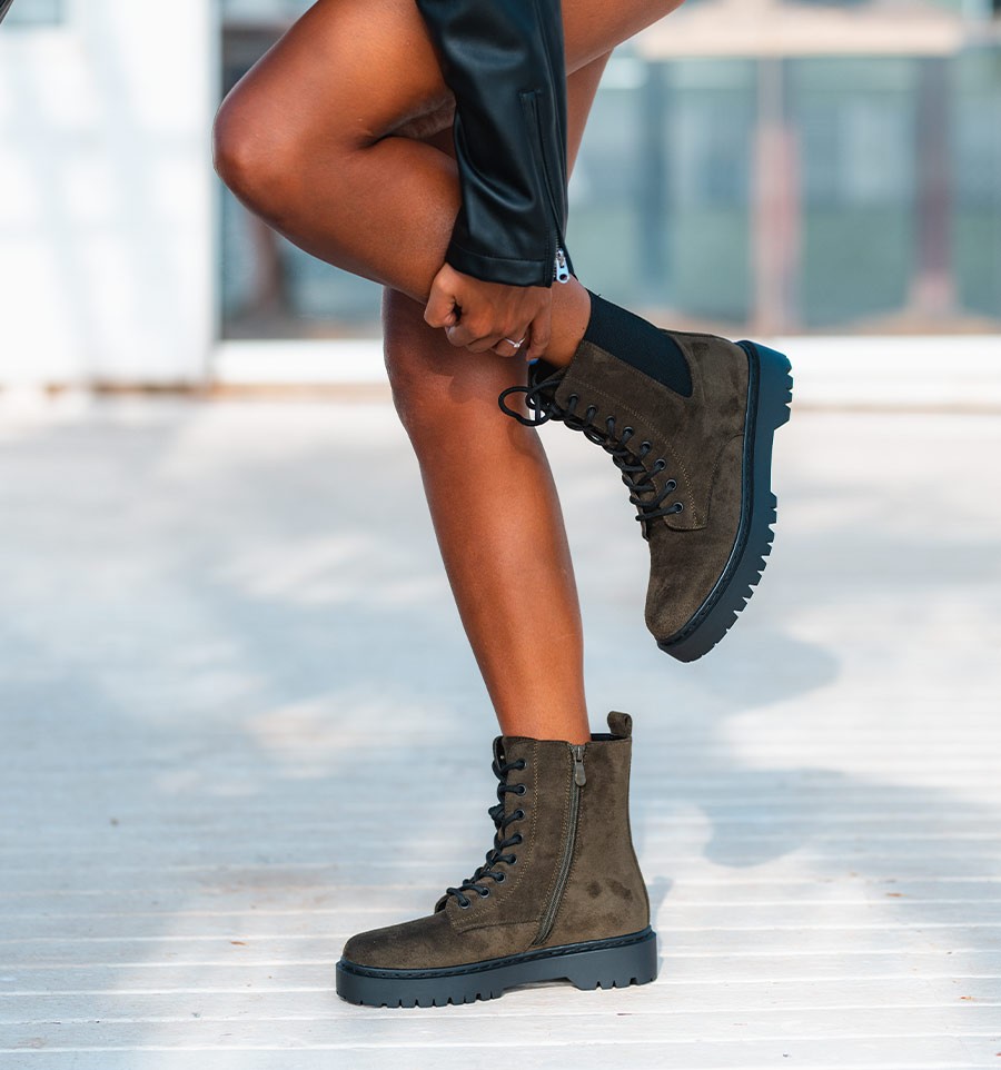 Botas militares verdes con cordones y suela track. Botas estilo moteras con cremallera y mucho rollo. El calzado tendencia renovado con colores como el dorado o el plata.