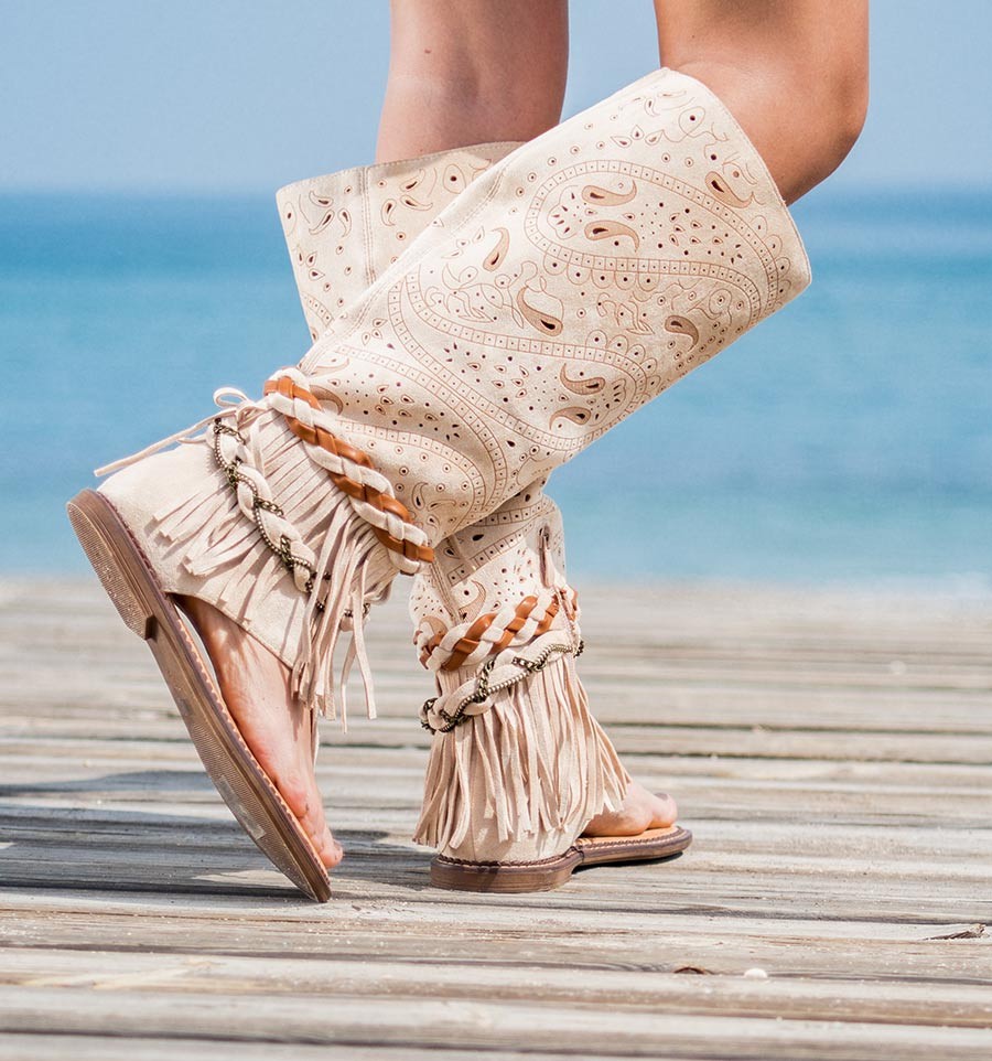 Preparadas para el verano? No, sin las botas sandalias altas Mikonos. Un calzado de mujer en plena tendencia del estilo boho. Caña alta y textil troquelado las hacen únicas. Combínalas como mas te guste , asegurate tu look.