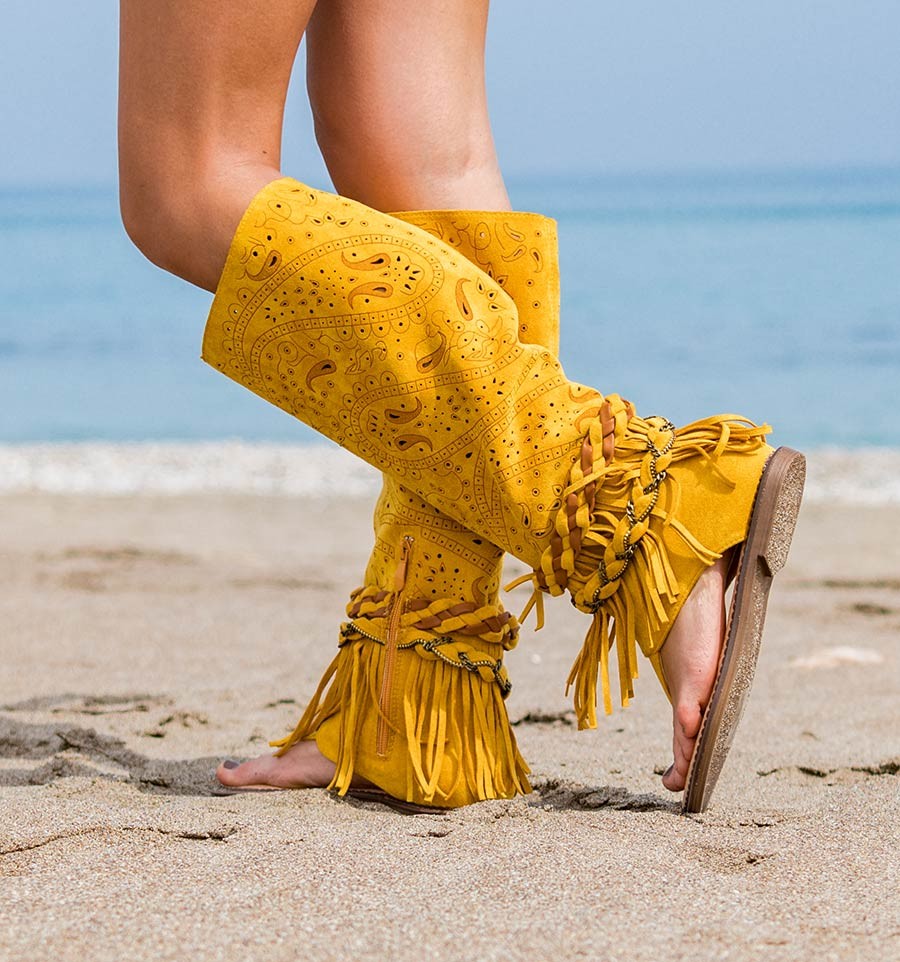 Preparadas para el verano? No, sin las botas sandalias altas Mikonos. Un calzado de mujer en plena tendencia del estilo boho. Caña alta y textil troquelado las hacen únicas. Combínalas como mas te guste, asegúrate tu look.