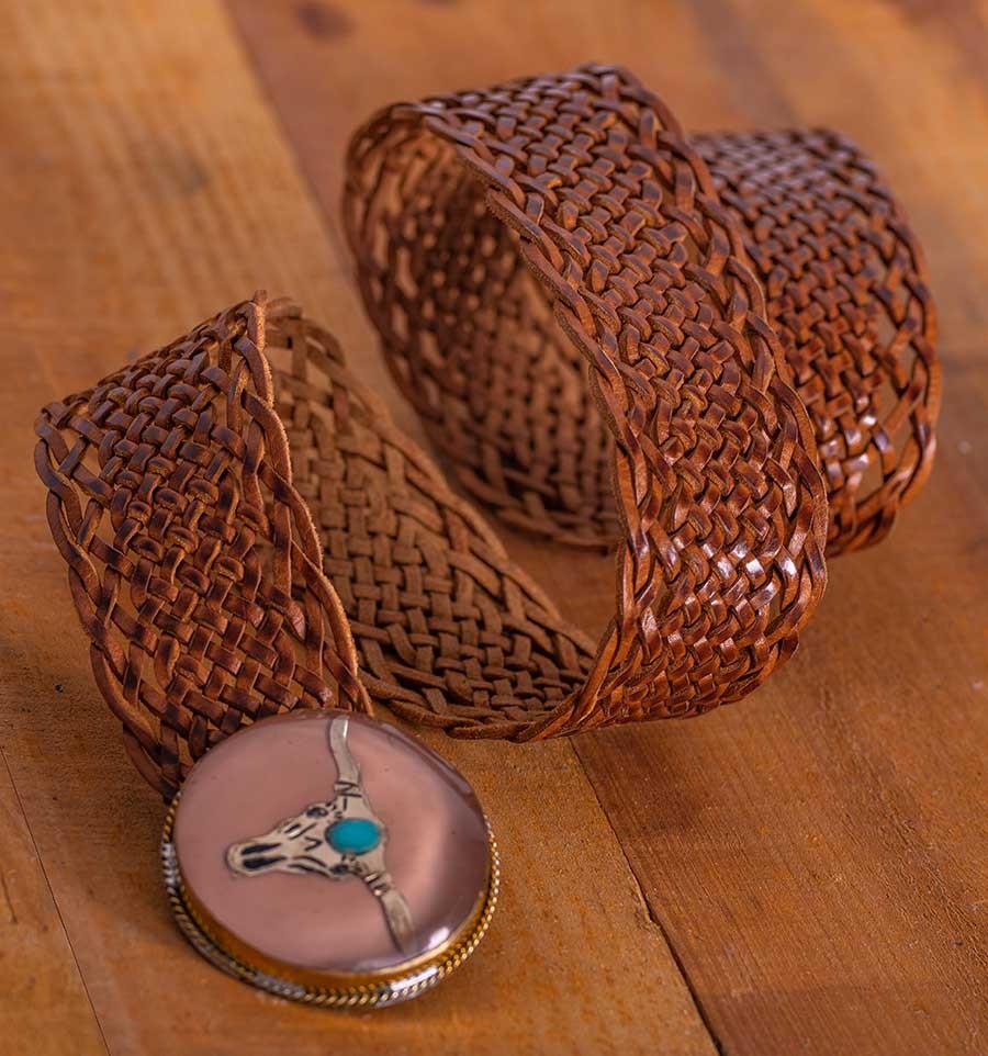 Un cinturón de cuero para mujer que se adapta a cualquier medida por su sistema de enganche en cualquier punto del mismo a través de su trenzado.