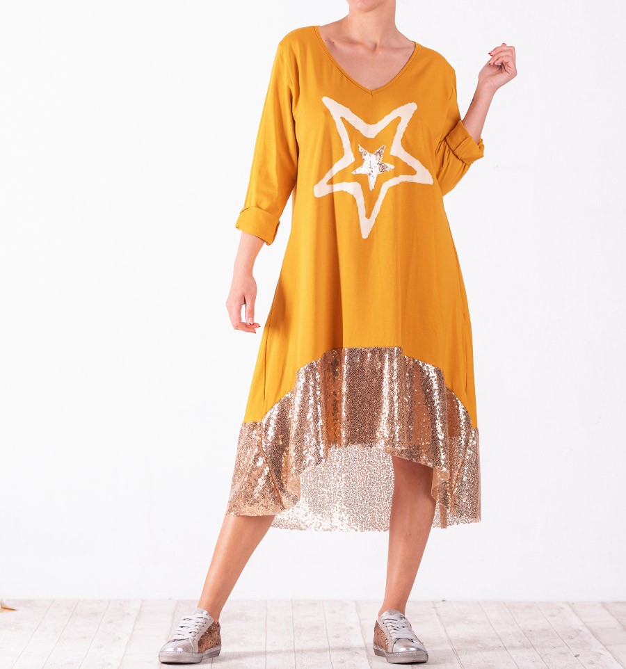 Los vestidos de temporada más boho y cómodos te esperan en nuestra nueva colección. Moda casual, con un toque fresco. Amplio vestido largo con bajo de lentejuelas dorado. Bogatell: Vestido de algodón con detalle de estrella.