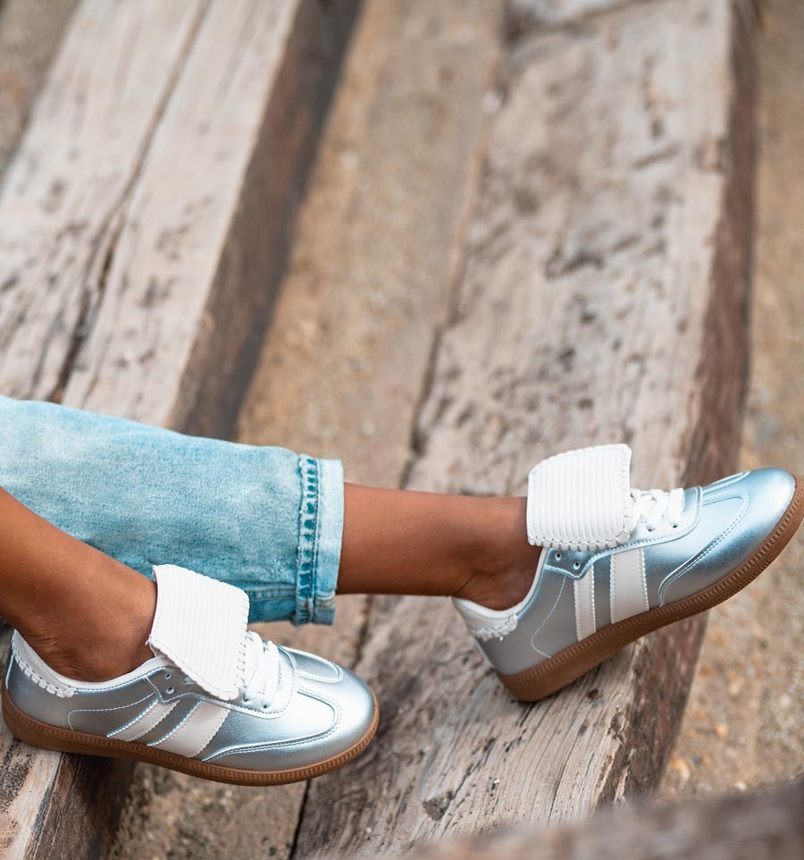 Zapatillas deportivas plateadas de moda con solapa en blanco. En cuerina con líneas blancas, cordones y suela de goma. Las zapatillas urbanas que van a arrasar este año. No contienen origen animal.
