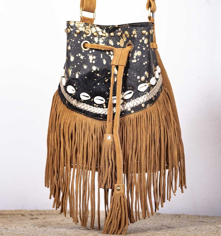 Hippie chic women's bag with fringes and shells. A perfect ethnic bag to complete your look. Bag with leather and natural hair printed with golden spots. Bag with studs and adjustable shoulder strap. Lined and with inside pocket. A perfect sack bag for this summer. It is a handmade product.