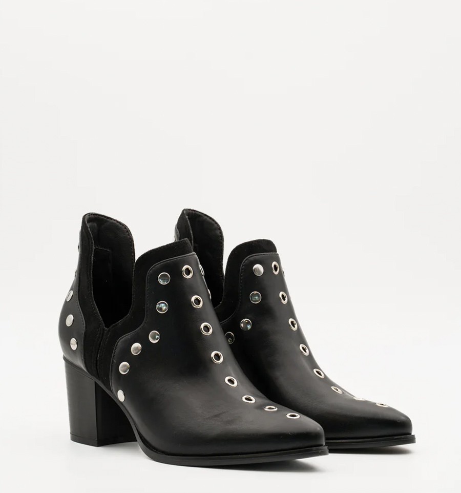 Black ankle boots with heels and studs, a cowboy-style boot with an open ankle. Made with soft faux leather. Cuban heel in wood, non-slip rubber sole. Padded insole for maximum comfort.Contains no animal products.