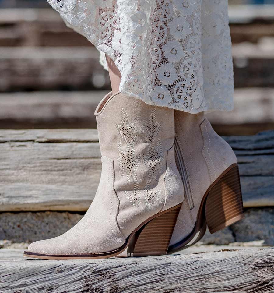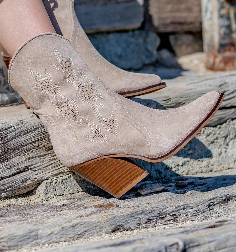 Cowgirl ankle boot with die-cut and embroidery, to complete your boho look. The model does not lose the essence of high-heeled ankle boots with a cowboy touch that are ideal to combine with long and flowing dresses, minis, denim...