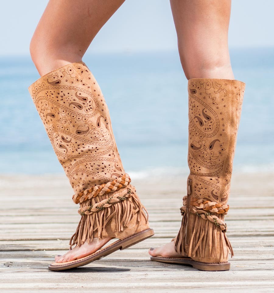 Ready for the summer? No, without the Mikonos high sandal boots. A women's footwear in full trend of the boho style. High cane and die-cut textile make them unique. Combine them as you like, make sure your look.