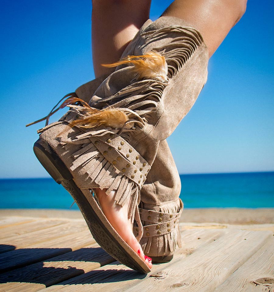 A good tan, some jeans shorts with a white blouse and some of our sandals boots, like the ones in the picture, the Selva model. A footwear for women in full trend of the boho style. With fixed fringes around the rod and on the outer side (with feathers), as well as two tapes with tacks (removable).
