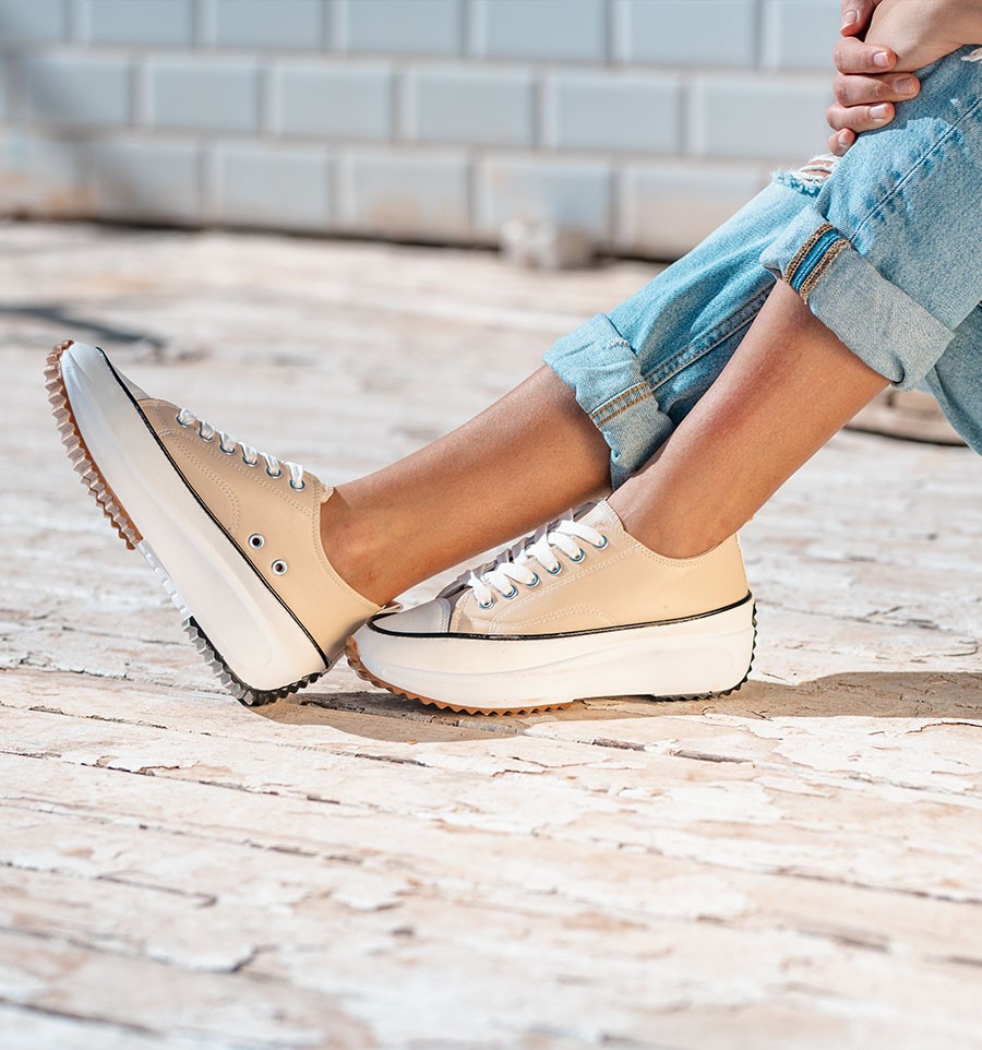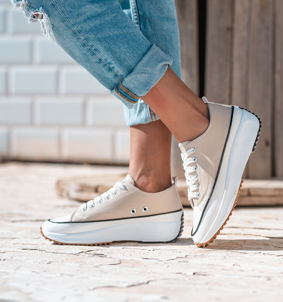 Now, a new version of the Caddy sports shoes, made of synthetic leather. Women's shoes with a molded platform and a toothed rubber sole. A pair of sneakers with a rubber toe cap and a rounded heel. Women's sports shoes that dominate street style.