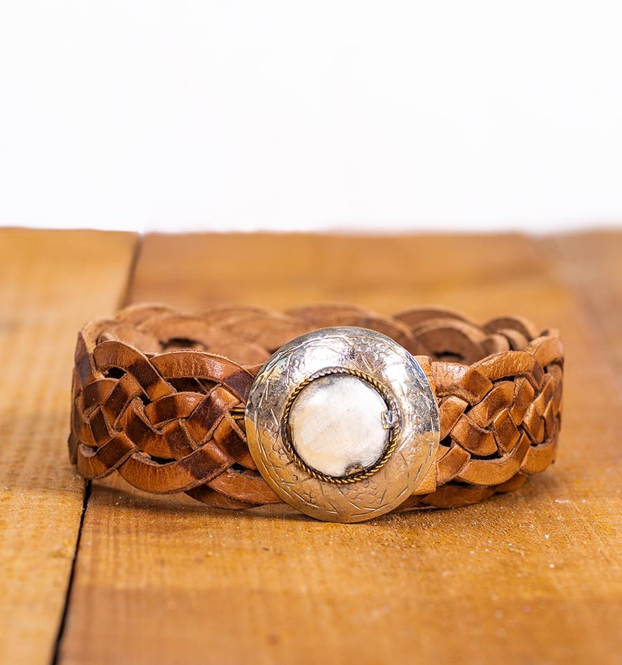 Fivela metálica redonda, com peça em resina e decoração em metal