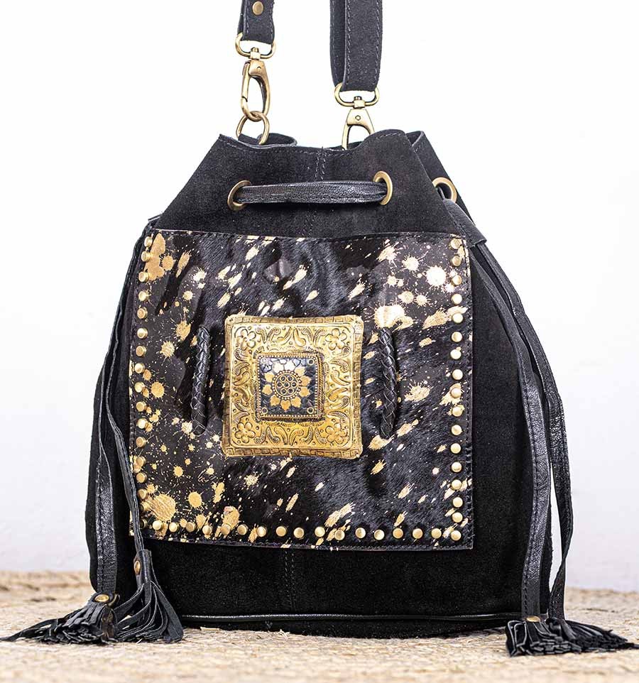 Saco estilo boho buckett. Saco feito à mão com tachas e pelo. Uma bolsa étnica, feita de couro (pele), com um estampado animal. Outra alternativa para completar o seu look boémio e dar-lhe um toque ligeiramente mais selvagem.