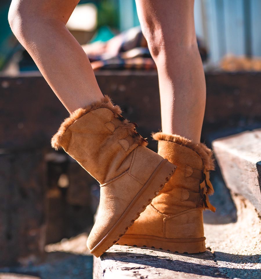 Botas castanhas australianas de meio vitelo com laços nas costas. Botas quentes e na moda, super confortáveis e acolhedoras.