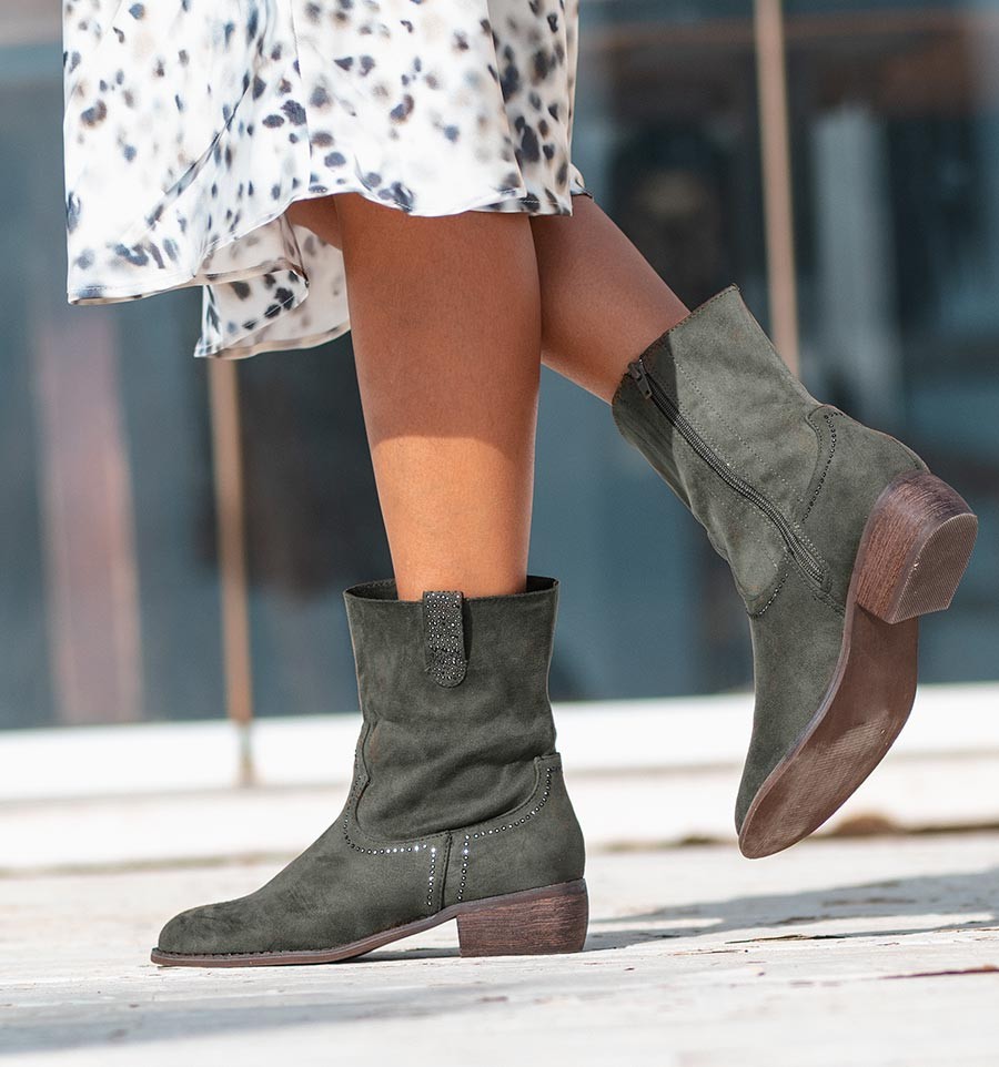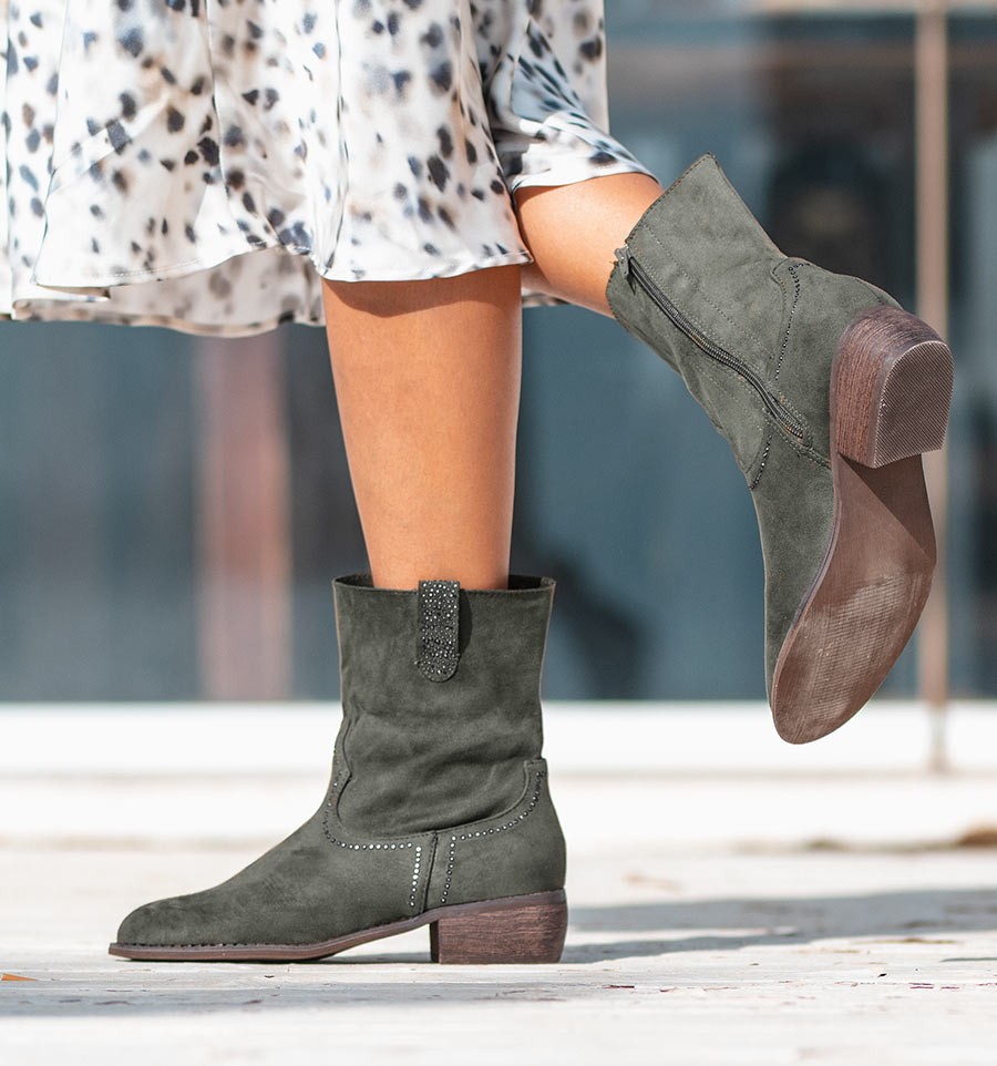 Hechas en material textil similar al serraje, con tacón tipo de goma efecto madera, antideslizantes. Son unos botines de mujer sumamente confortables con su plantilla acolchada y la cremallera. No contienen origen animal.