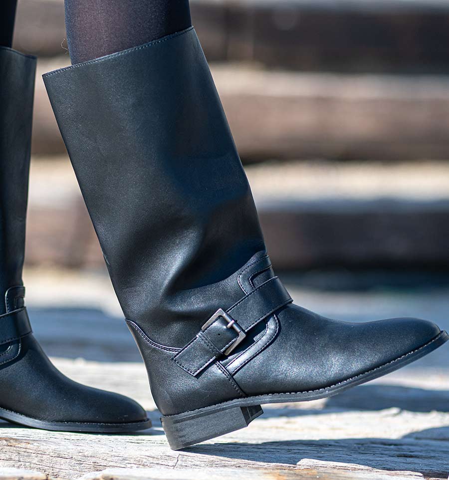 Botas altas pretas com fivela para mulher. As botas indispensáveis para o inverno. Combine-as com diferentes visuais, consoante o look que pretende obter. Livre de animais