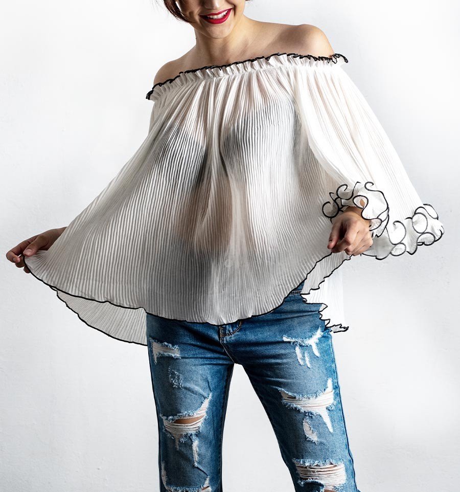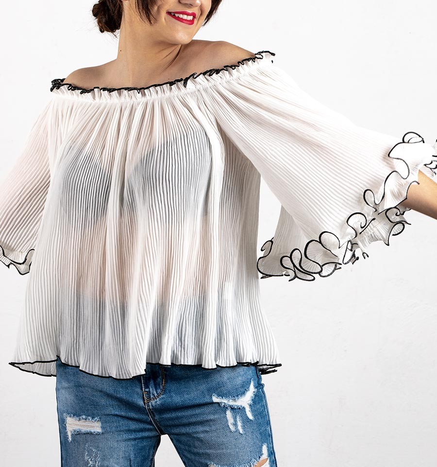 Blusa semi-transparente Marea. Uma blusa pregueada com gola elástica, de cor branca quebrada. Esta primavera aposte nesta camisa com babados com costura contrastante (cor preta) e manga com sino. Blusa Marea, uma peça de roupa com muito estilo.