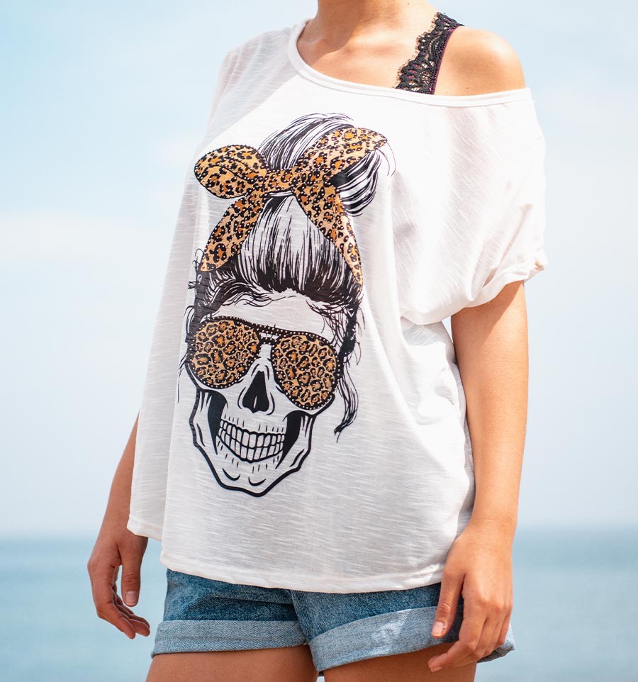 Seguindo a tendência atual, optamos pela estampa de leopardo em uma camiseta básica solta. Uma regata que combina facilmente com jeans, shorts, leggings, saias ... Uma camiseta feminina que vai mostrar o seu lado mais selvagem!