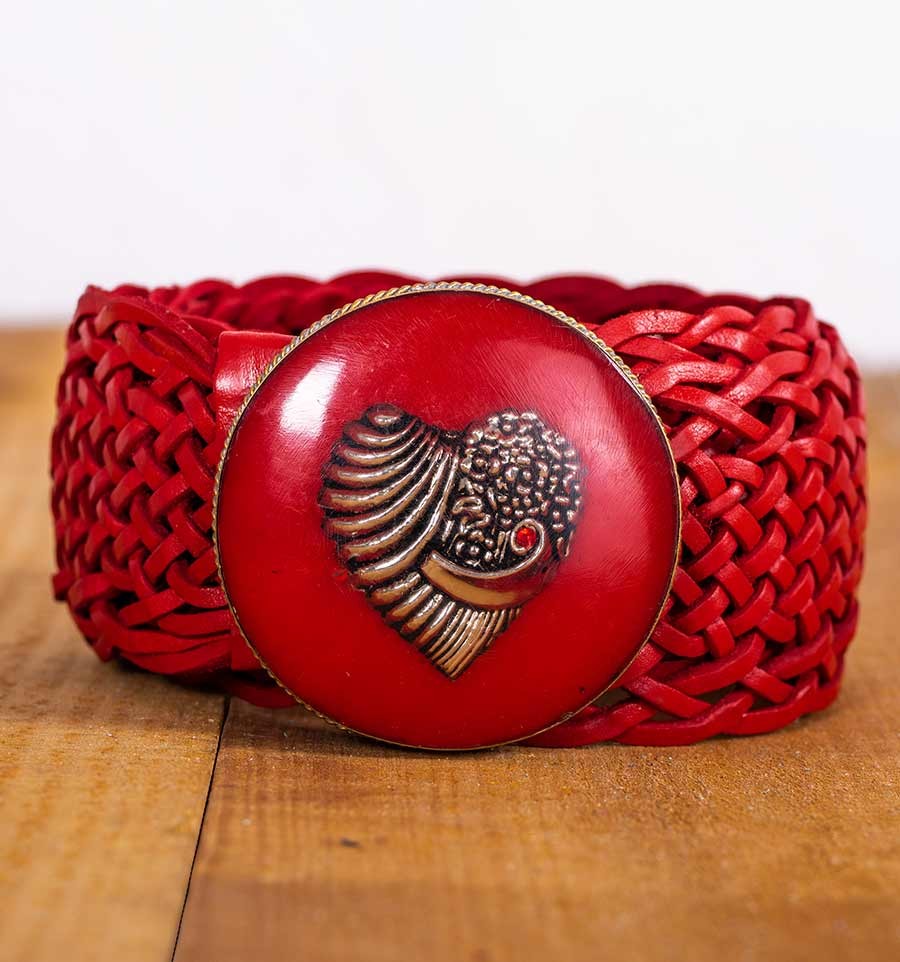 Cinto trançado de couro vermelho estilo boho com grande fivela de resina. Acessório hippie chique para os seus looks mais Ibiza. Peça central decorada com coração esculpido, pequenos pedaços de madeira na fivela sob a resina. Aro e fecho em latão. Um cinto de couro para mulheres que se adapta a qualquer tamanho devido ao seu sistema de engate em qualquer ponto do cinto através de sua trança. Este é um cinto feito à mão, então nenhum é igual ao outro.