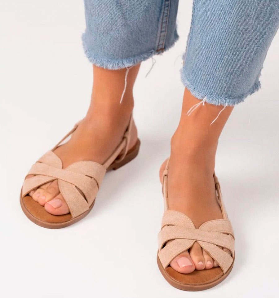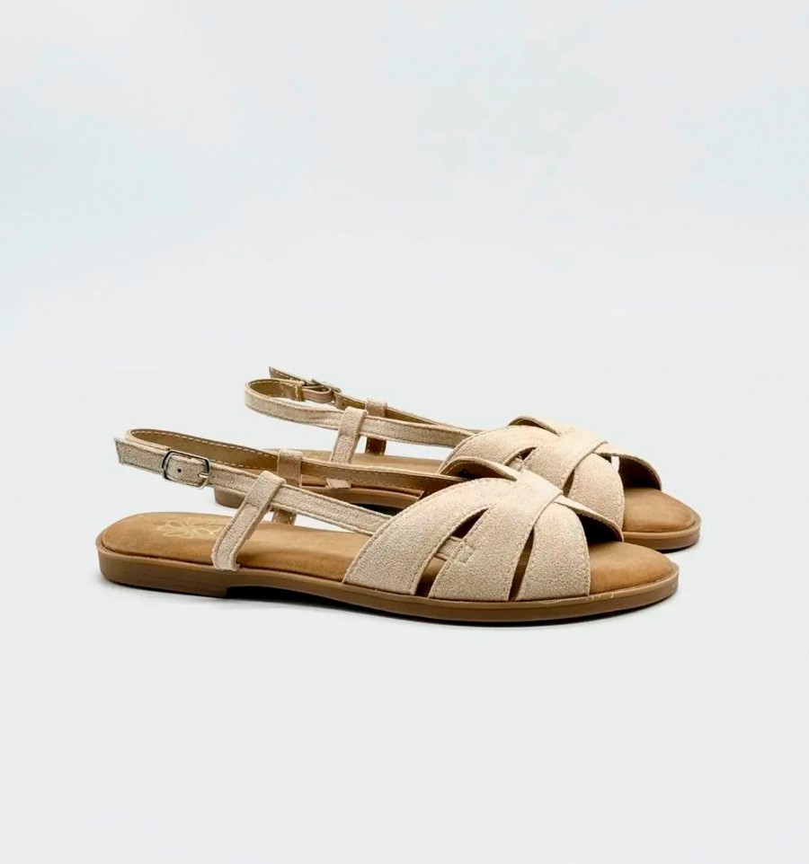 Sandálias bege estilo caranguejo com um toque boémio e tornozelo com cordões. Uma sandália confortável e lisonjeira com uma palmilha almofadada e uma sola antiderrapante. Um leve toque de Ibiza para os seus looks quotidianos. Sem animais.