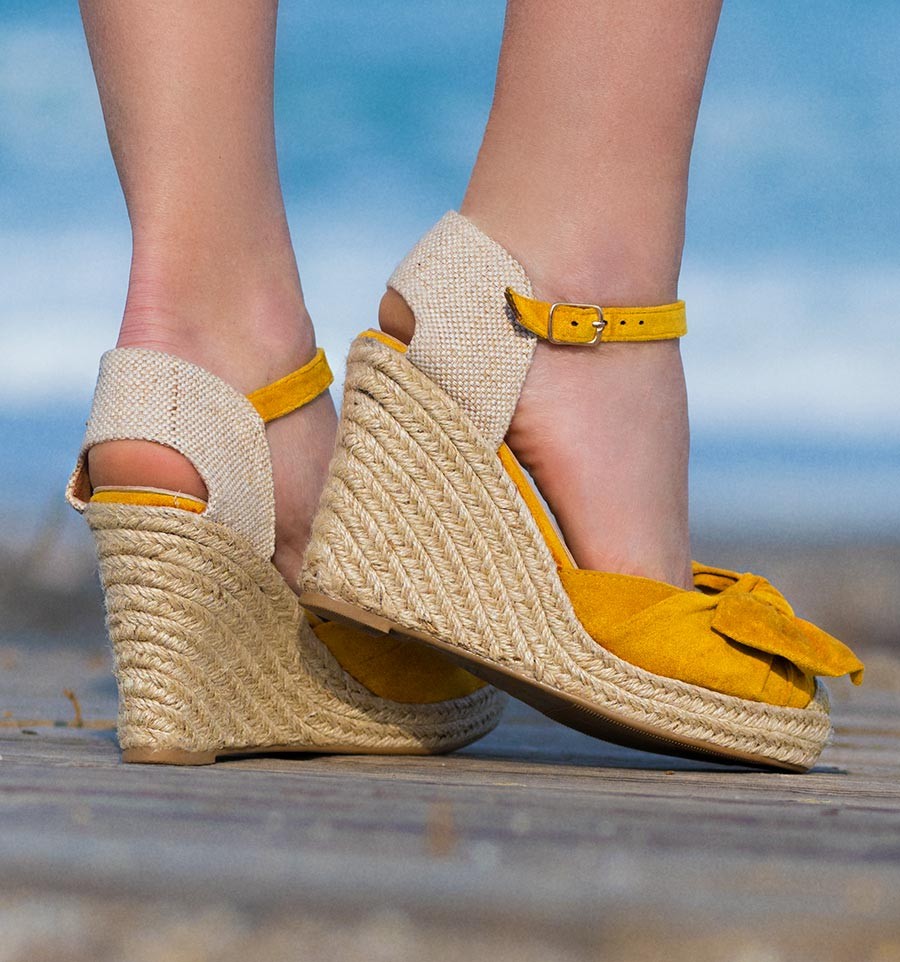 Sandálias de cunha. Embora sejam um clássico, não podemos ficar sem eles. É o modelo Kailua, sandálias esparto, com arco e tira decorativos com fechamento ajustável no tornozelo. Além disso, a sua plataforma leve fará você ganhar alguns centímetros.
