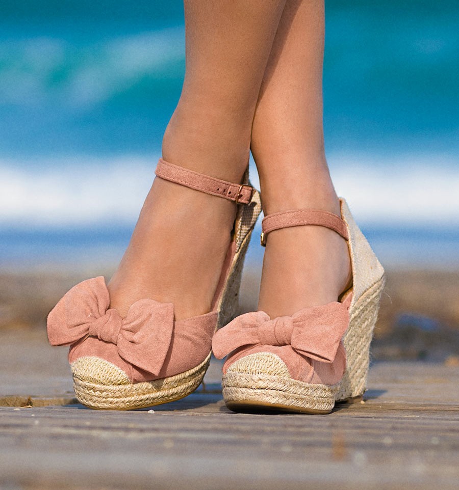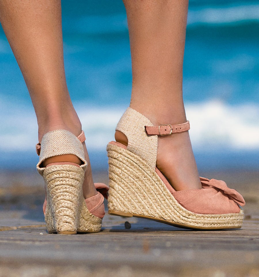 Sandálias de cunha. Embora sejam um clássico, não podemos ficar sem eles. É o modelo Kailua, sandálias esparto, com arco e tira decorativos com fechamento ajustável no tornozelo. Além disso, a sua plataforma leve fará você ganhar alguns centímetros.
