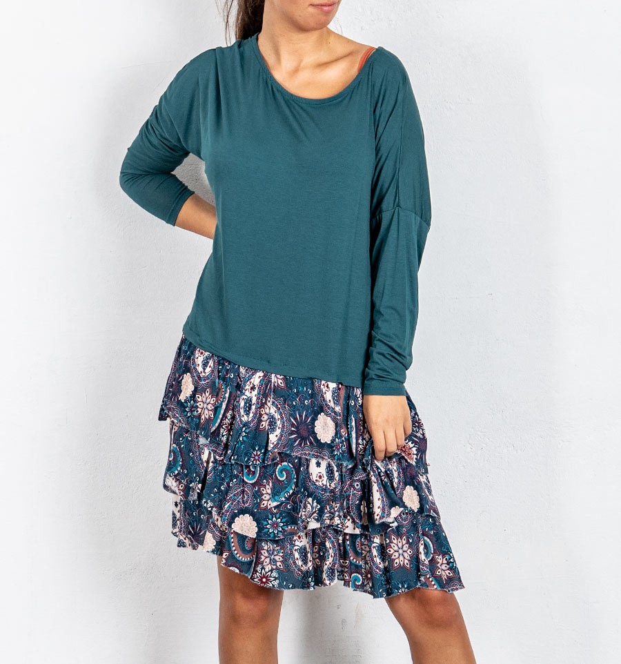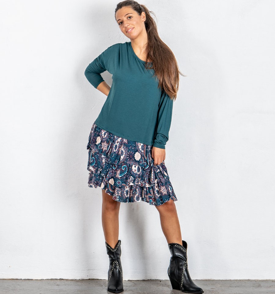 Os ares dos anos sessenta emanam deste vestido largo e curto com gola redonda e saia com babados em peças cortadas. Agaram, vestido de manga comprida com estampado na saia. Gostamos dos babados, o detalhe que ilumina qualquer estilo!