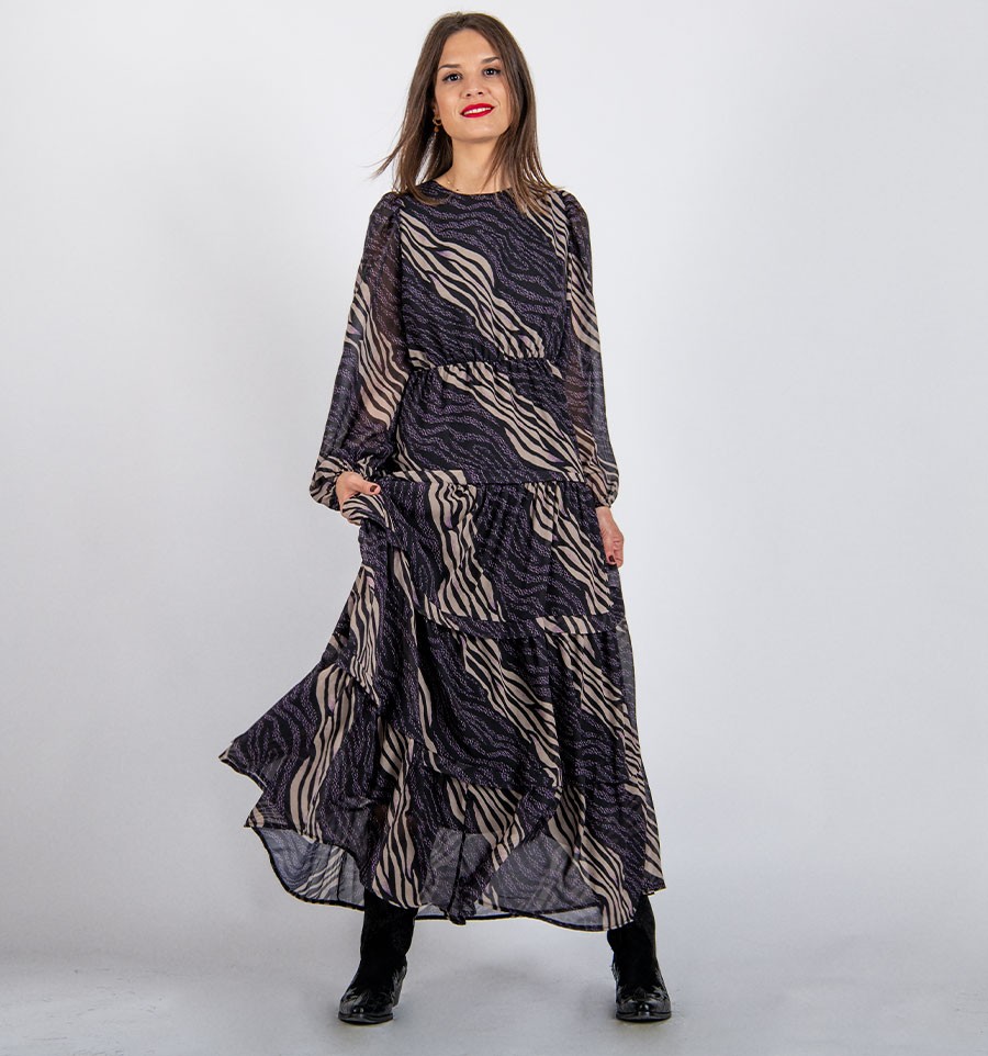 Em nossa coleção mais um vestido longo de inspiração romântica. Vestido estampado, fluido e versátil. Vestido com babados na saia, decote redondo na gola. Vestido de manga comprida. Experimente usar com botas ou botins para conseguir um look feminino, ousado e livre ...